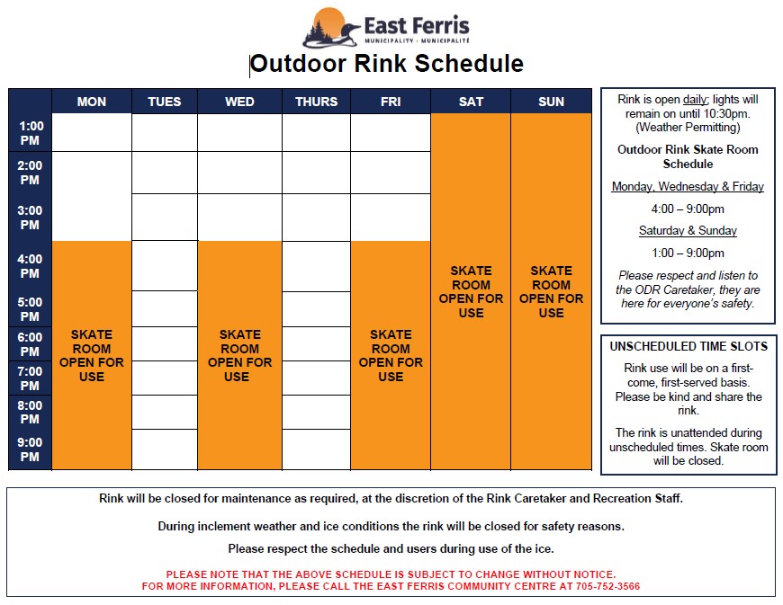 The East Ferris Outdoor Rink (ODR) is located at 390 Highway 94 at Vrebosch Park. This seasonal rink is dedicated to community use and is maintained by municipal staff during the winter months.